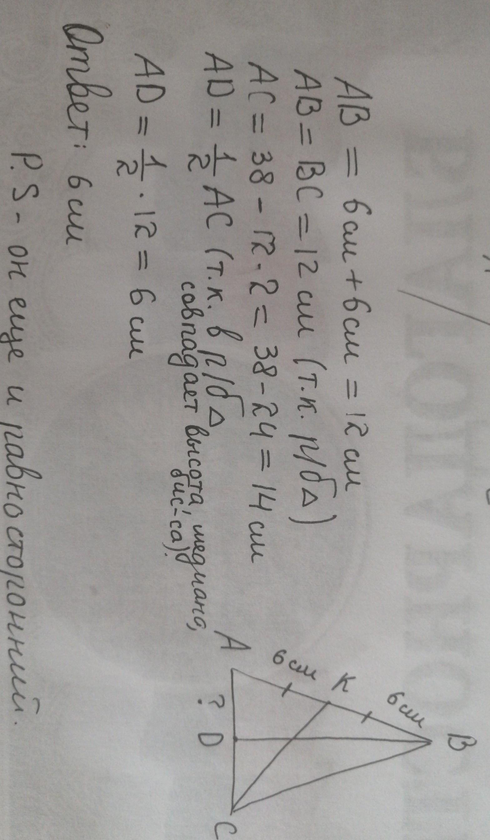 В равнобедренном треугольнике ABC из угла при основании проведена медиана СК на боковую сторону. Длина отрезка кв равно 6 см. Из вершины B на основание опущена высота ВД. Определите длину АД, если периметр треугольника равен 38 см? ( Постройте рисунок по условию задачи)