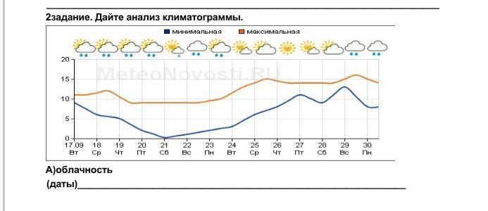 2задание. Дайте анализ климатограммы. А)облачность (даты)_____________________________________________________________ __________________________________________________________________________ Б) самая низкая температура ______________дата___________________________ В) самая высокая температура ________________дата__________