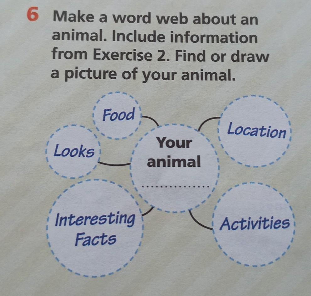 6 Make a word web about an animal. Include information from Exercise 2. Find or draw a picture of your animal. Food Location Looks Your animal Interesting Facts Activities