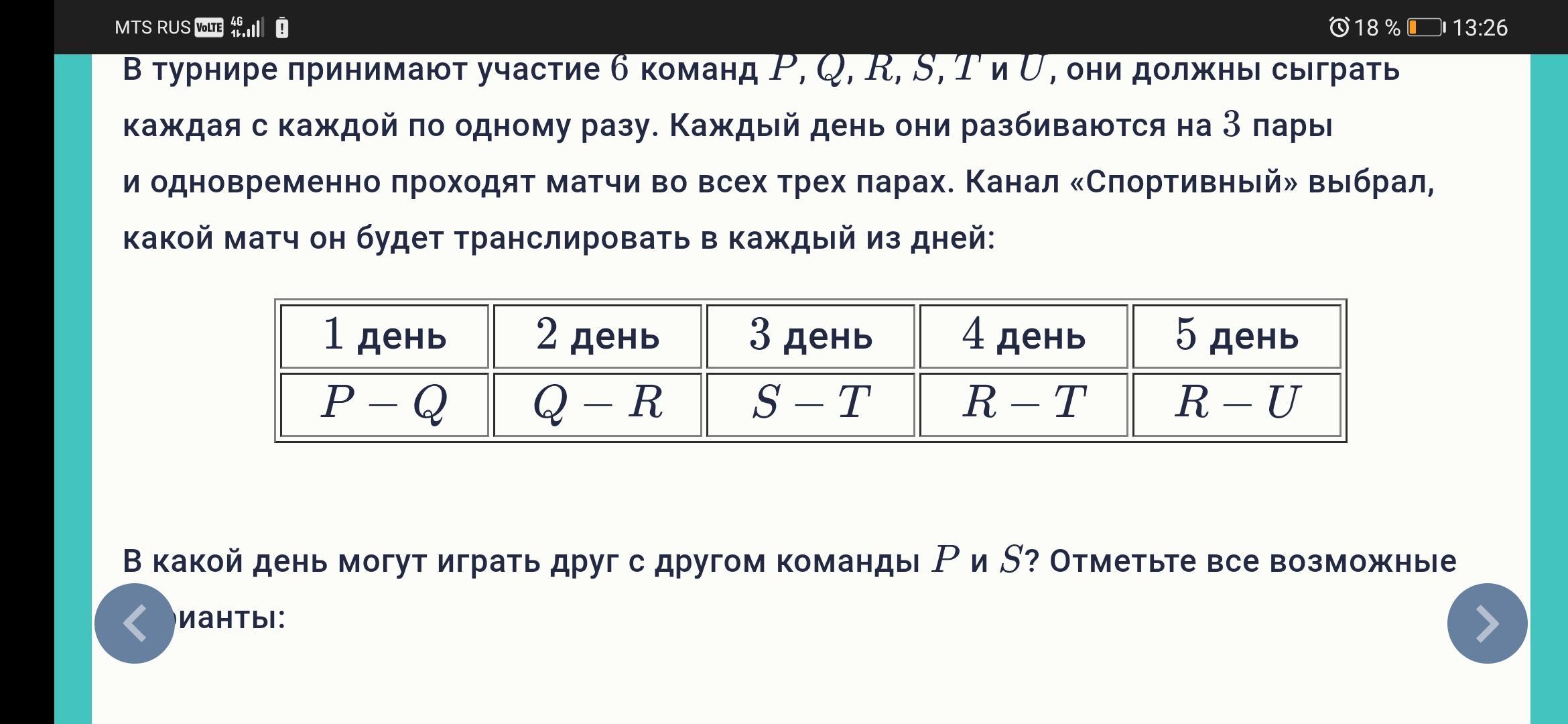 В какой день могут играть друг с другом команды P и S? Отметьте все возможные варианты: