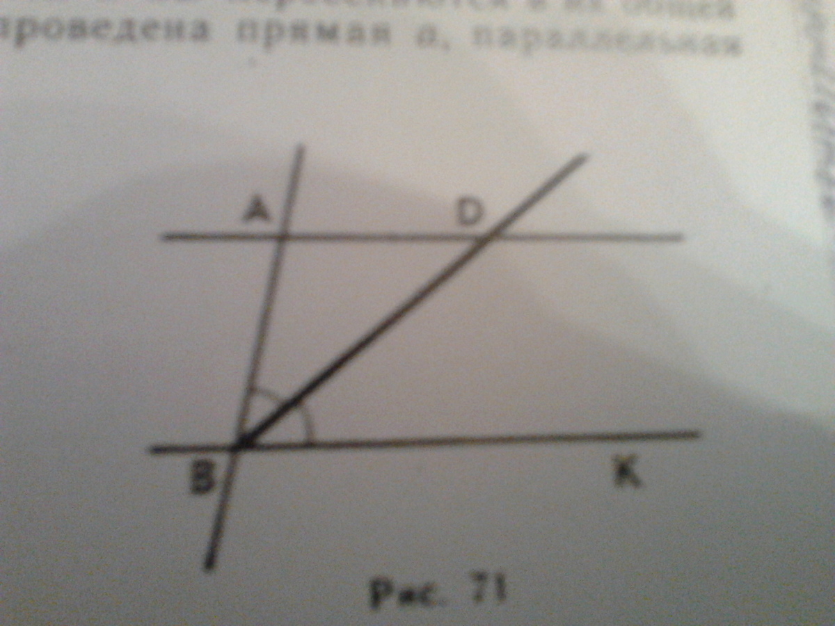 (картинка есть) Помогите срочно!!На рисунке 71 прямые AD и BK параллельны луч BD биссектриса угла ABK. угол АBK=80 градусов. Найдите углы треугольника ABD