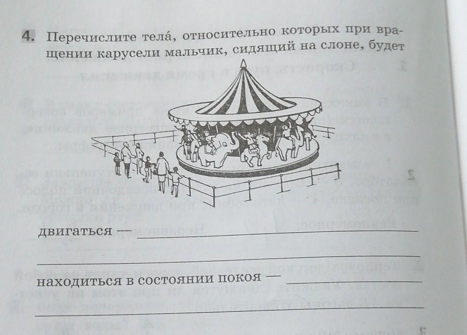 двигаться будет относительно земли, ограждение, людей, которые стоят за ограждением. находиться в состоянии покоя относительно самой карусели, всех фигур на карусели.