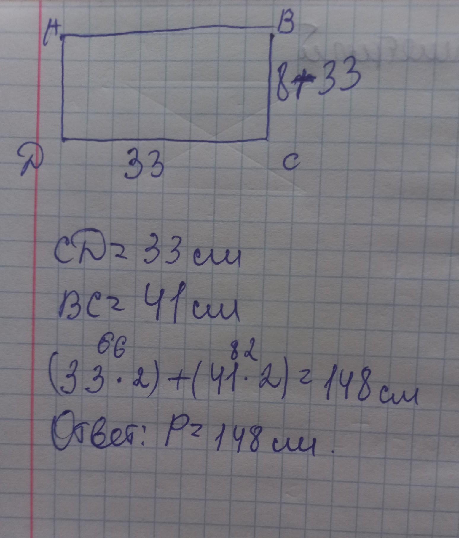 Одна сторона прямоугольника равна 33 см, а вторая — на 8 см больше. Вычисли периметр прямоугольника.