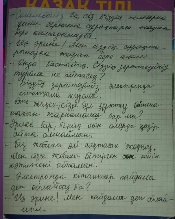 2.Сіз белгілі бір телеарнаның журналисісіз. «Қала тұрғындарының саудаға иекемділігі» тақырыбында ақпарат жинау үшін сауалнама алу тапсырылды. Адамдарға осы тақырып төңірегінде сұрақтар қойсаңыз, жауап қандай болуы мүмкін? Ойдан интервью-сауалнама құрастырып жазыңыз,
