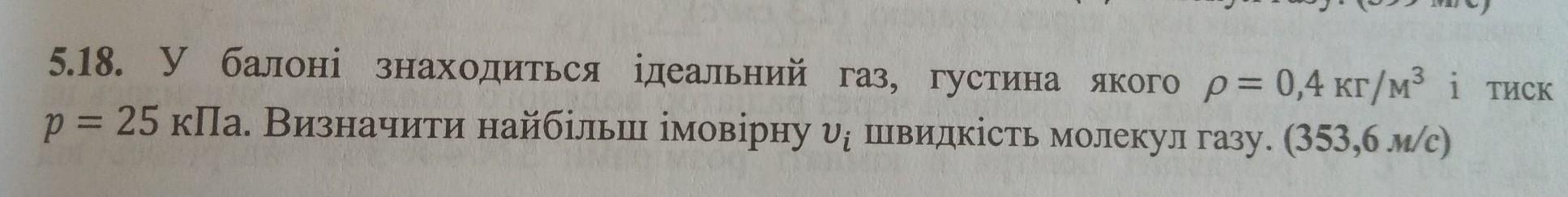 В баллоне находится идеальный газ, плотность которого р = 0,4 кг / м и давление р = 25 кПа. Определить наиболее вероятную скорость молекул газа. (353,6 м / c)