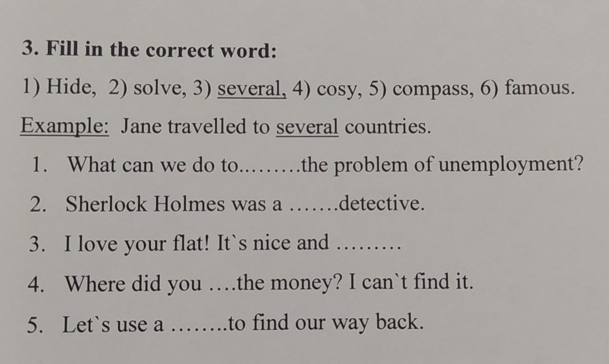 3. Fill in the correct word: 1) Hide, 2) solve, 3) several, 4) cosy, 5) compass, 6) famous. Example: Jane travelled to several countries. 1. What can we do to.........the problem of unemployment? 2. Sherlock Holmes was a .......detective. 3. I love your flat! It's nice and ......... 4. Where did you ....the money? I can't find it. 5. Let's use a ........to find our way back.