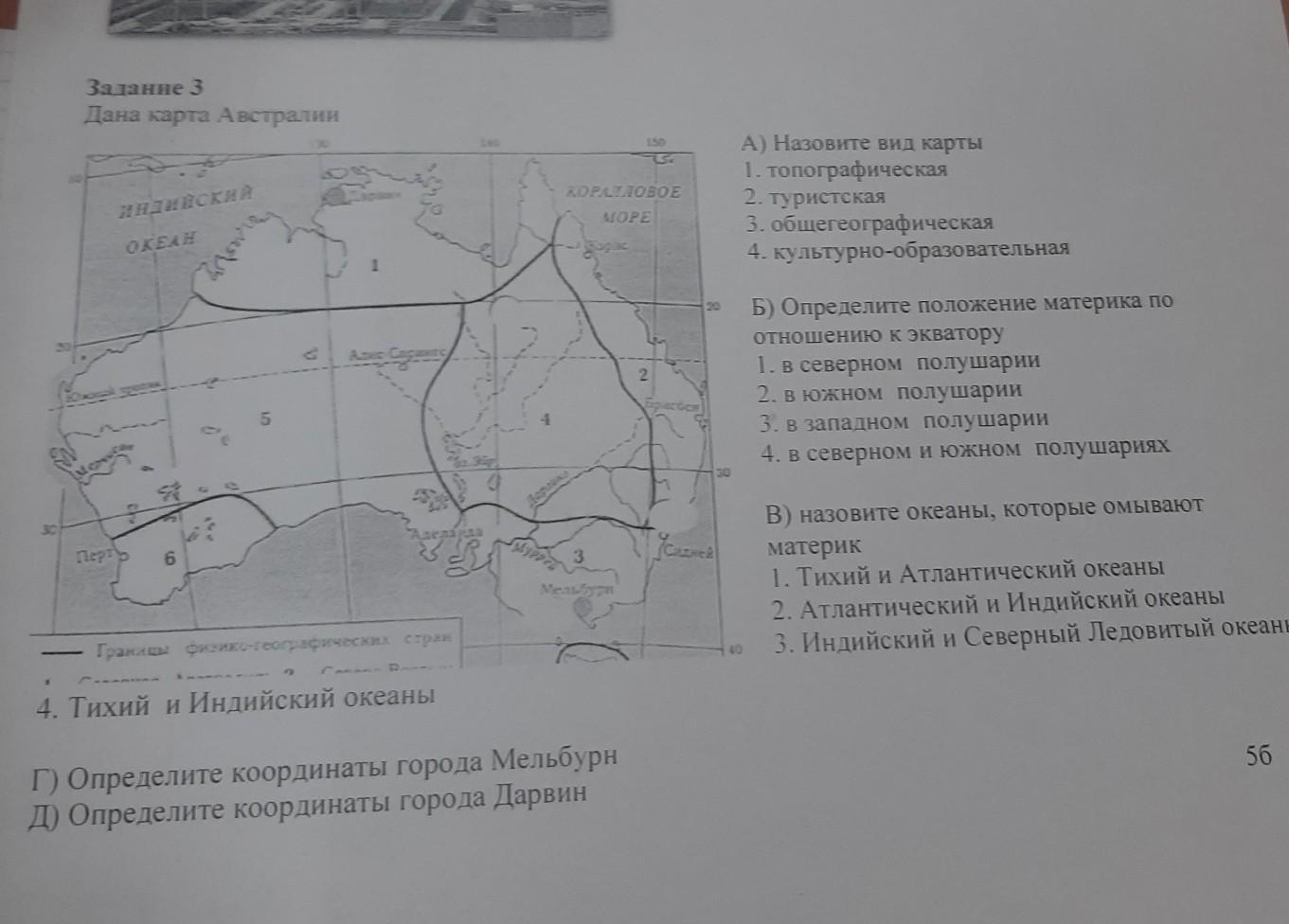 Задание 3 Дана карта Австралии 10 Индийский OKEAH! КОРАЛОВОЕ MOPE A) Назовите вид карты 1. топографическая 2. туристская 3. общегеографическая 4. культурно-образовательная Крис 20 2 Б) Определите положение материка по отношению к экватору 1. в северном полушарии 2. В южном полушарии 3. в западном полушарии 4, в северном и южном полушариях 5 Fructen arts Перть 6 3 Croned Мел-ура В) назовите океаны, которые омывают материк 1. Тихий и Атлантический океаны 2. Атлантический и Индийский океаны 3. Индийский и Северный Ледовитый оке Границы физико-географических стран 40 Тихий и Индийский океаны Определите координаты города Мельбурн Определите координаты города Дарвин 5