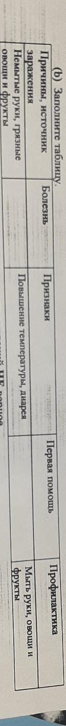 Признаки Первая помощь Профилактика (b) Заполните таблицу. Причины, источник Болезнь заражения Немытые руки, грязные овощи и фрукты Повышение температуры, диарея Мыть руки, овощи и фрукты