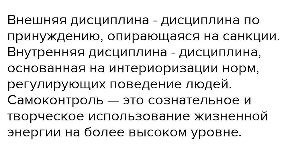 Внешняя дисциплина-соблюдение установленных правил благодаря контролю со стороны. Внутренняя дисциплина-соблюдение правил по своей воле, по своему внутреннему побуждению, без внешних санкций и принудительных мер. Следовательно, отличие в том, что во внешней тебя контролируют, а во внутренней контроль не нужен.