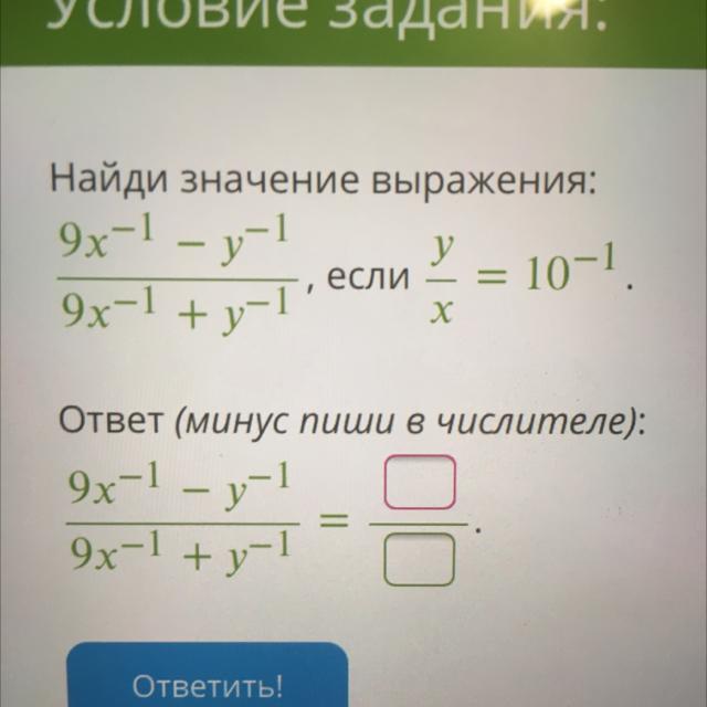 (9x⁻¹-y⁻¹)/(9x⁻¹+y⁻¹)=(9/x -1/y)/(9/x +1/y)=((9y-x)/(xy))/((9y+x)/(xy))=(9y-x)/(xy) ·(xy)/(9y+x)=(9y-x)/(9y+x)=((9y-x)/y)/((9y+x)/y)=(9 -x/y)/(9 +x/y)=(9-10)/(9+10)=-1/19