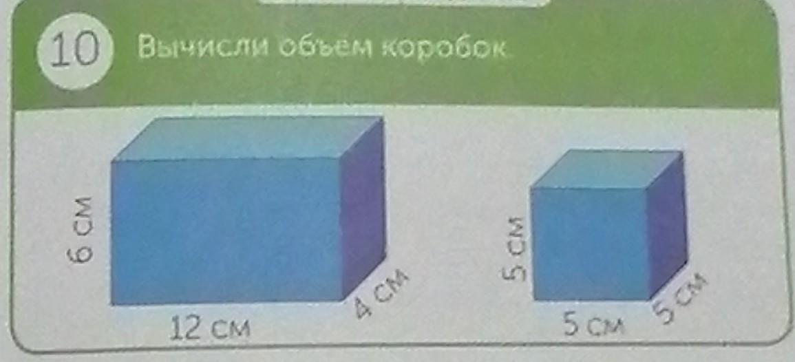 Пошаговое объяснение: Чтобы посчитать объём надо перемножить длину на ширину и на высоту 6 см × 12 см × 4 см = 288 см кубических 5 см × 5 см × 5 см = 125 см кубических