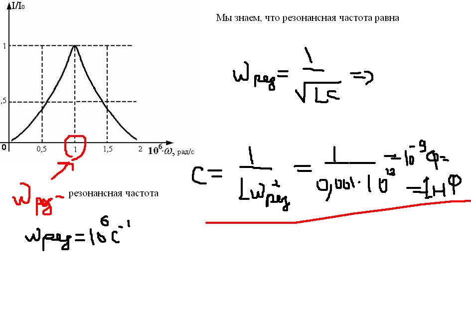 На рисунке представлена зависимость относительной амплитуды колебаний силы тока в катушке индуктивностью 1мГн, включенной в колебательный контур. Емкость конденсатора этого контура равна...