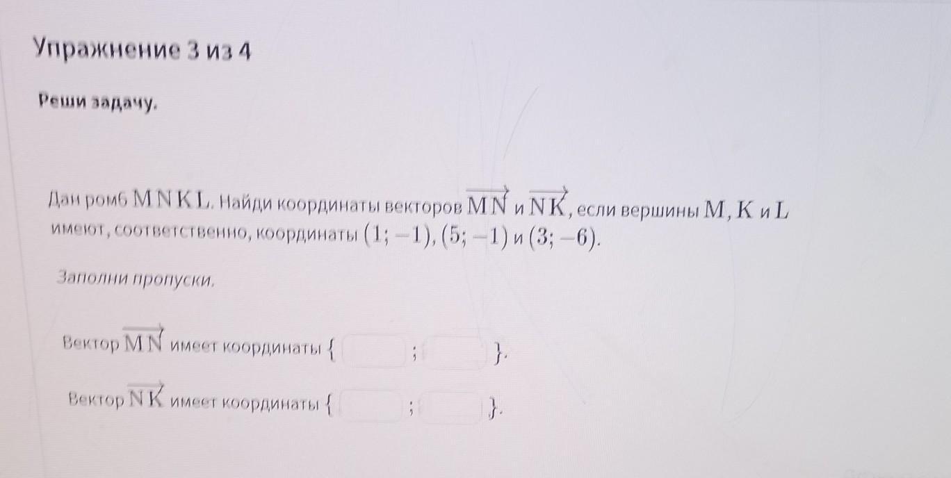 Дан ромб MNKL. Найди координаты векторов MN и NK, если вершины M, Кит имеют, соответственно, координаты (1; -1), (5; -1) и (3; — 6). срочно
