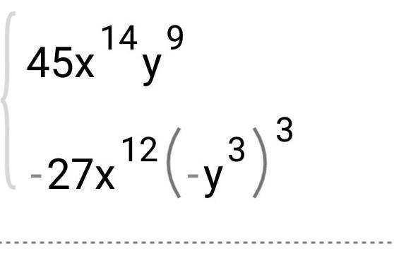 (45x¹⁴y⁹)/(-27x¹²(y³)³)= (9*5x¹²*x²*y⁹)/(-9*3x¹²(-y⁹))=-5x²/3.