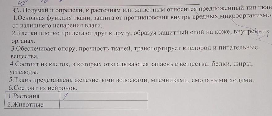 кции турции С.. Подумай и определи, к растениям или животным относится предложенный тип тканей: 1.Основная функция ткани, защита от проникновения внутрь вредных микроорганизмов, от излишнего испарения влаги. 2.Клетки плотно прилегают друг к другу, образуя защитный слой на коже, внутренних органах. 3. Обеспечивает опору, прочность тканей, транспортирует кислород и питательные вещества. 4.Состоит из клеток, в которых откладываются запасные вещества: белки, жиры, Углеводы. 5.Ткань представлена железистыми волосками, млечниками, смоляными ходами. 6.Состоит из нейронов. 1.Растения 1,3 2. Животные
