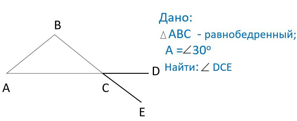 Треугольник АВС - равнобедренный по условию, значит, что углы ВАС и ВСА равны 30 градусам. Углы ВСА и DCE равны, так как они вертикальные. BCA = DCE = 30