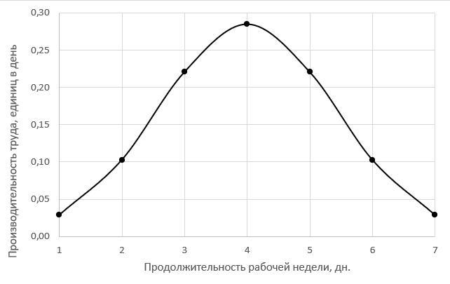 Группа исследователей проанализировала результаты эксперимента по влиянию продолжительности рабочей недели на производительность труда (см. график ниже) и сделала следующие выводы: