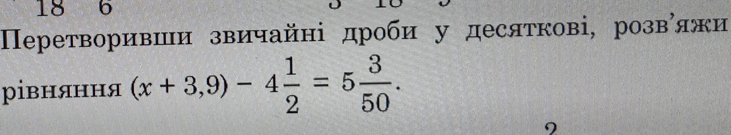 Завдання : Перетворивши звичайні дроби у десяткові, розв'яжи рівняння (x + 3,9) - 4 1/2 = 5 3/50