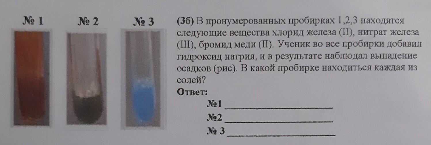 В пронумерованных пробирках 1,2,3 находятся следующие вещества хлорид железа (ll), нитрат железа (lll), бромид меди (ll). Ученик вовсе пробирки и добавил гидроксид натрия, и в результате наблюдали выпадение осадков. К какой пробирке находится каждая из солей?