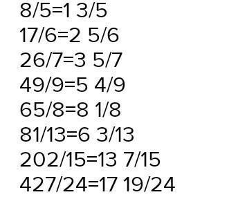 350. Выделите целую часть, записав в виде обыкновенной дроби частное: 1) 8: 5; 2) 17 : 6; 3) 26 : 7; 4) 49 : 9; 5) 65 : 8; 6) 81 : 13; 7) 131 : 10; 8) 202 : 15; 9) 427 : 24. ФОТО!!!