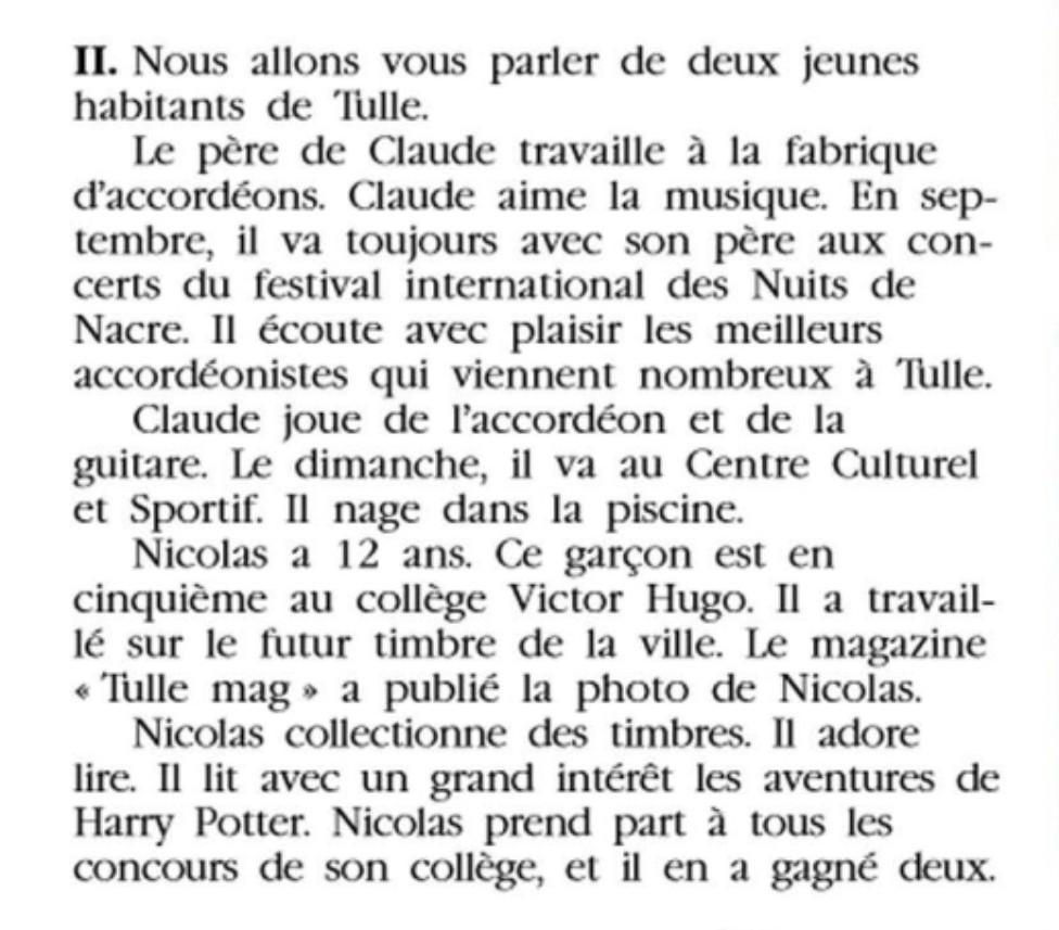 лё пэр дё Клод травай а ля фабрикь дакордэон. Клод эм ля мюзикь. Ан септамбр иль ва тужур авекь сон пэр о консэр дю фэстиваль антернасьёналь де ньуи дё накр. иль экут авекь плезир ле мейёр акордэонист ки вьен номбро а Тюль.