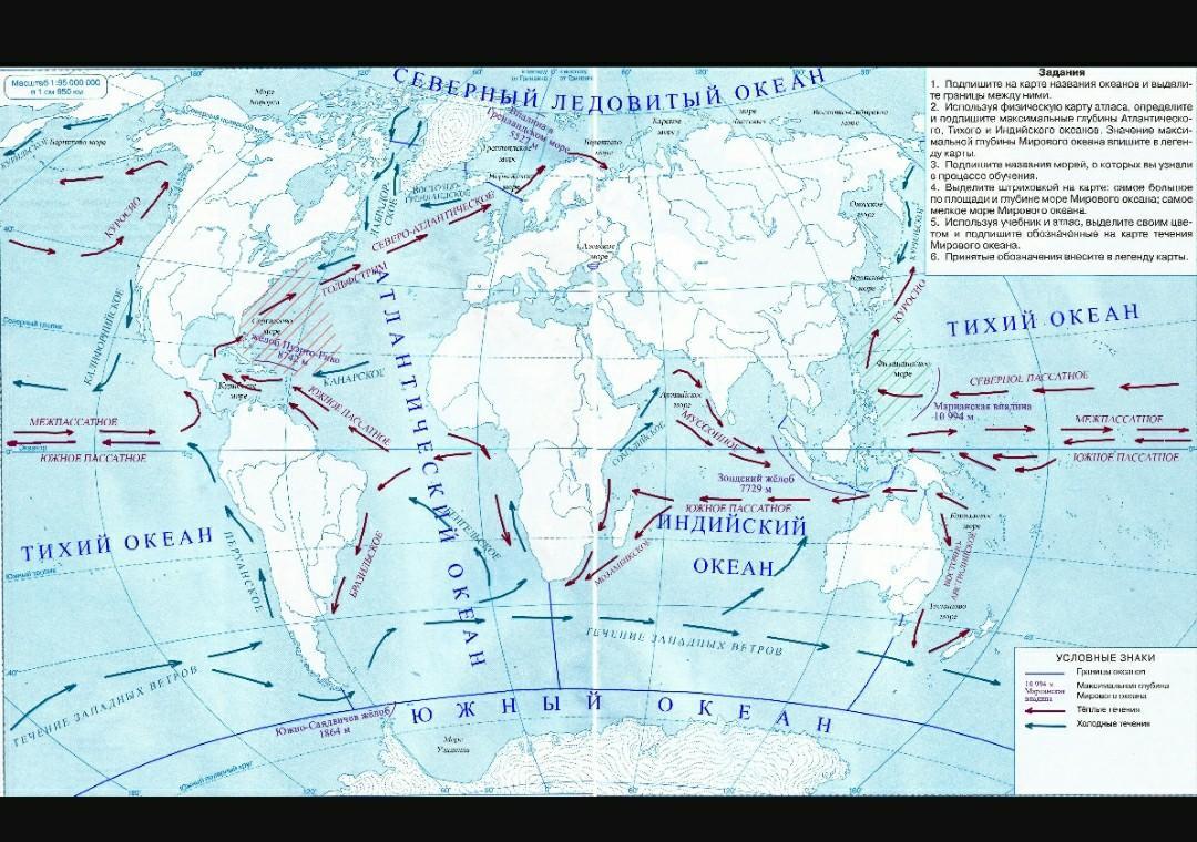 Задания те границы между ними. 1. Подпишите на карте названия океанов и выдели- 2. Используя физическую карту атласа, определите ГО, Тихого и Индийского океанов. Значение макси- и подпишите максимальные глубины Атлантическо- в ду карты. 3. Подпишите названия морей, о которых вы узнали в процессе обучения. 4. Выделите штриховкой на карте: самое большое по площади и глубине море Мирового океана; самое мелкое море Мирового океана. 5. Используя учебник и атлас, выделите своим цве том и подпишите обозначенные на карте течени Мирового океана. 6. Принятые обозначения внесите в легенду карты