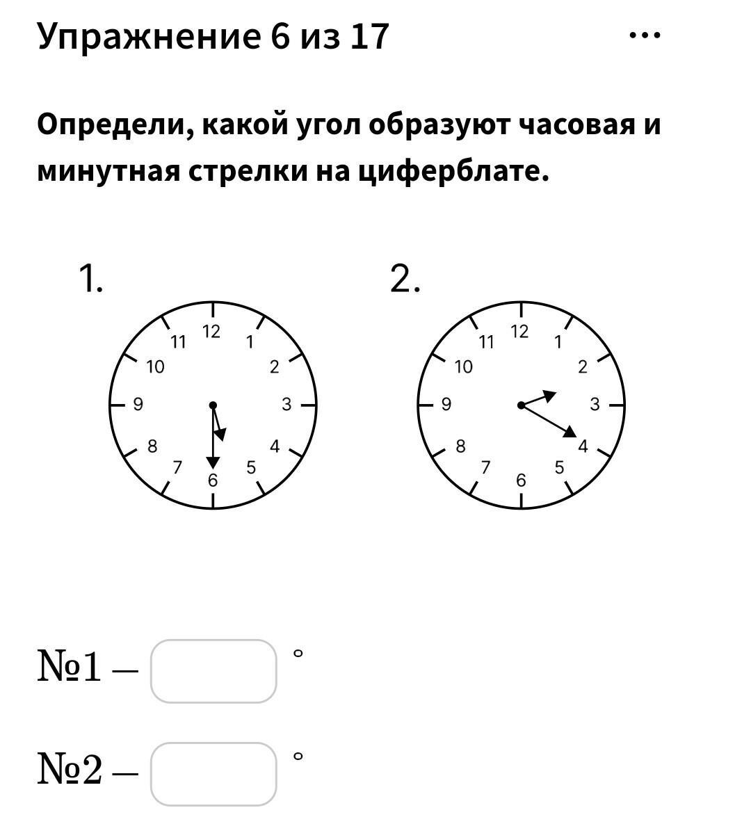 между 12 и 6 образуется развернутый угол, равный 180°, один час составляет 30°