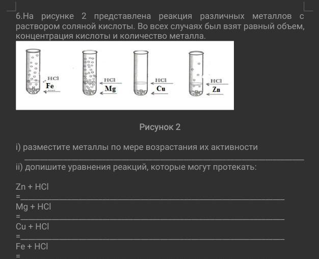 6.На рисунке 2 представлена реакция различных металлов с раствором соляной кислоты. Во всех случаях был взят равный объем, концентрация кислоты и количество металла. HCI Zn Fe Mg Рисунок 2 1) разместите металлы по мере возрастания их активности ii) допишите уравнения реакций, которые могут протекать: Zn + HCl Mg + HCl Cu + HCl Fe + HCI 7. Выполните задание, представленной ниже используя информацию из таблицы