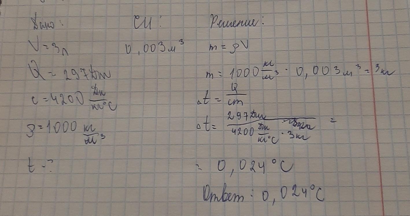 Определи, на сколько градусов нагреется вода объёмом 3 л, если ей сообщить количество теплоты, равное 297 Дж. Удельная теплоёмкость воды равна 4200 Дж/(кг·°C), плотность воды — 1000 кг/м³.