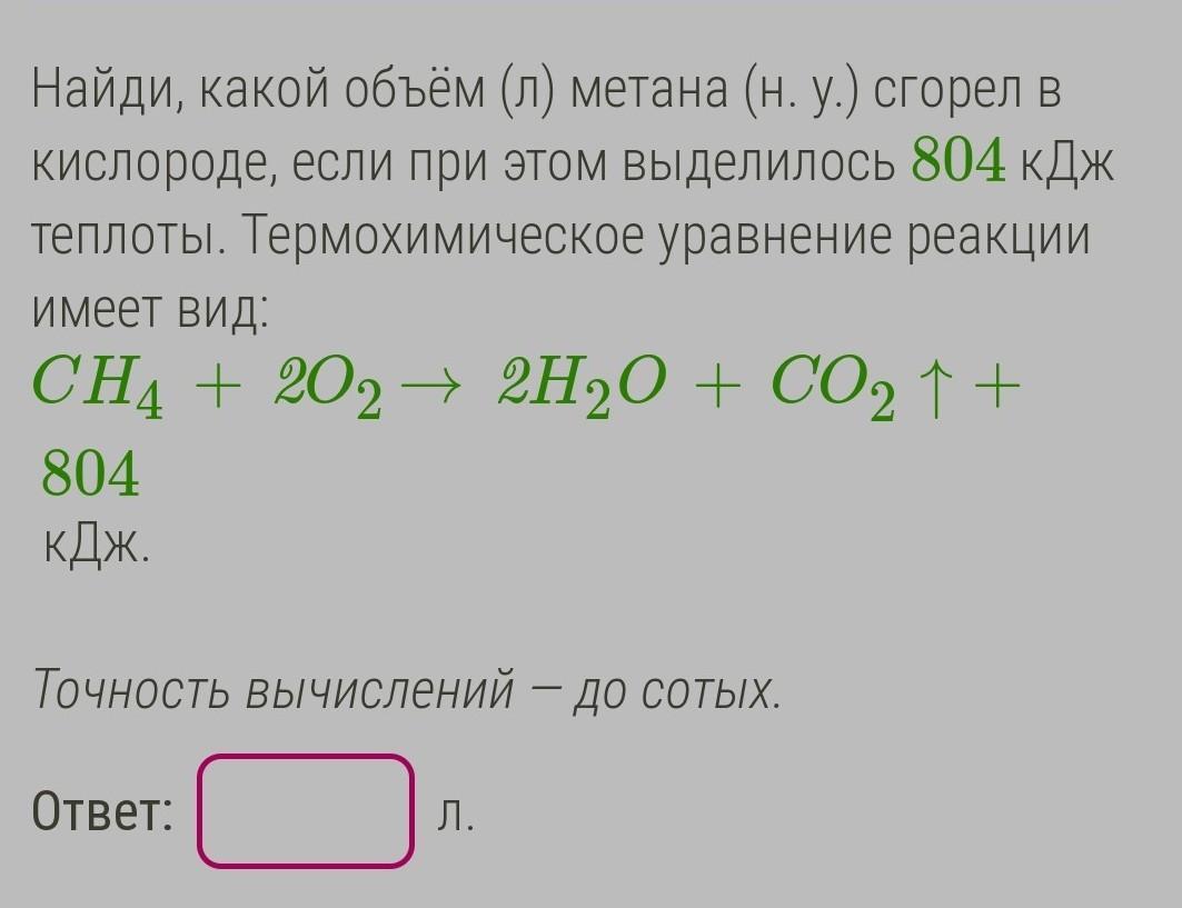 Найди, какой объём (л) метана (н. у.) сгорел в кислороде, если при этом выделилось 804 кДж теплоты. Термохимическое уравнение реакции имеет вид: