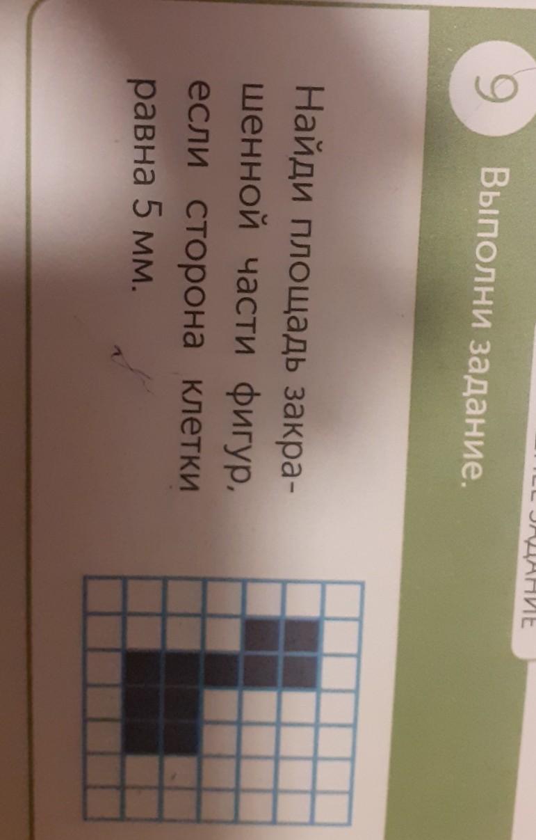9 Выполни задание. Найди площадь закра- шенной части фигур, если сторона клетки равна 5 мм.
