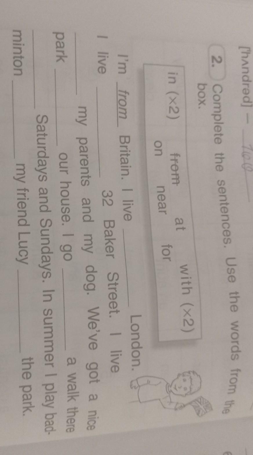I live in London. I live at 32 Baker Street. I live with my parents and my dog. We've got a nice park near our house. I go for a walk there on Saturdays and Sundays. In summer I play badminton with my friend Lucy in the park
