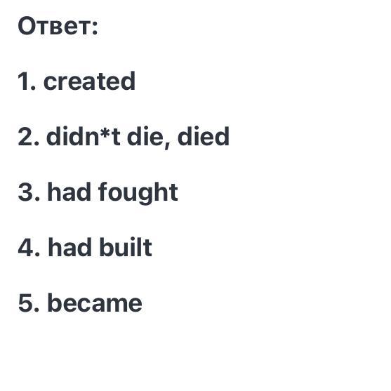 Put the verbs into the Past Simple. 1 Genghis Khan (create) the Great Mongolian Empire about 800 years ago. 2 Marie Curie (not/die) in 1910. She (die) in 1934. 3 William Wallace (fight) against England. 4 According to an Irish legend, Finn MacCool (build) the Giant’s Causeway. 5 Abraham Lincoln (become) president at the age of 52.