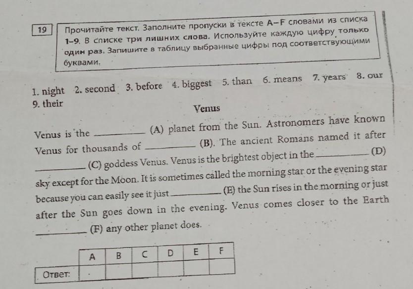 Прочитайте текст. Заполните пропуски в тексте A-F словами из списка 1-9, в списке три лишних слова. Используйте каждую цифру, только один раз. Запишите в таблицу выбранные цифры под соответствующими буквами.