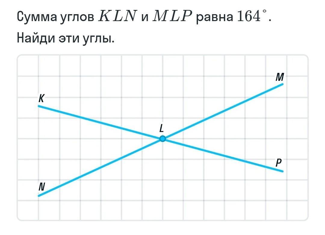 Так как сумежные углы всегда равны, то KLN=MLP=164° разделить на 2=82°. сума всех углов на рисунке=360°, по этому 360°-164°=196°, а 196° разделить на 2=98°=NLP=KLM(равны потому что сумежные)