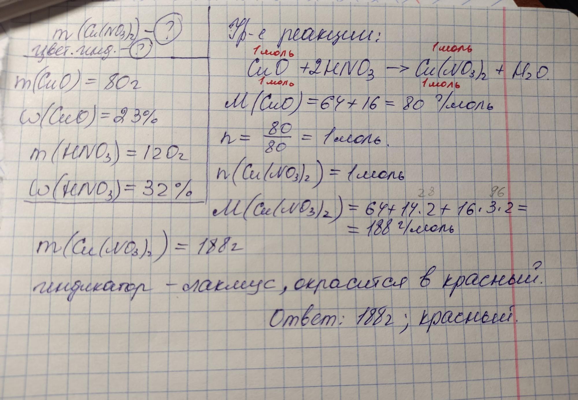 Определите массу соли и цвет индекатора если 80 грам 23% оксида меди || смешать с 120г 32% азотная кислота
