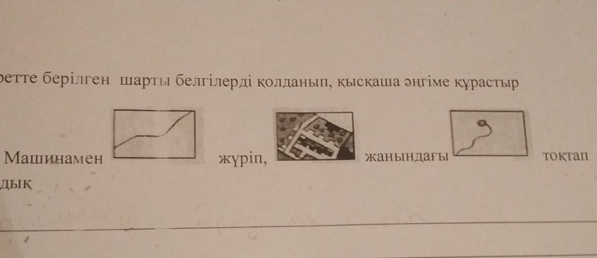 4. Суретте берілген шарты белгілерді қолданып, кыскаша әңгіме құрастыр Машинамен жүріп, Жанындағы TOKTAN демалдық 1