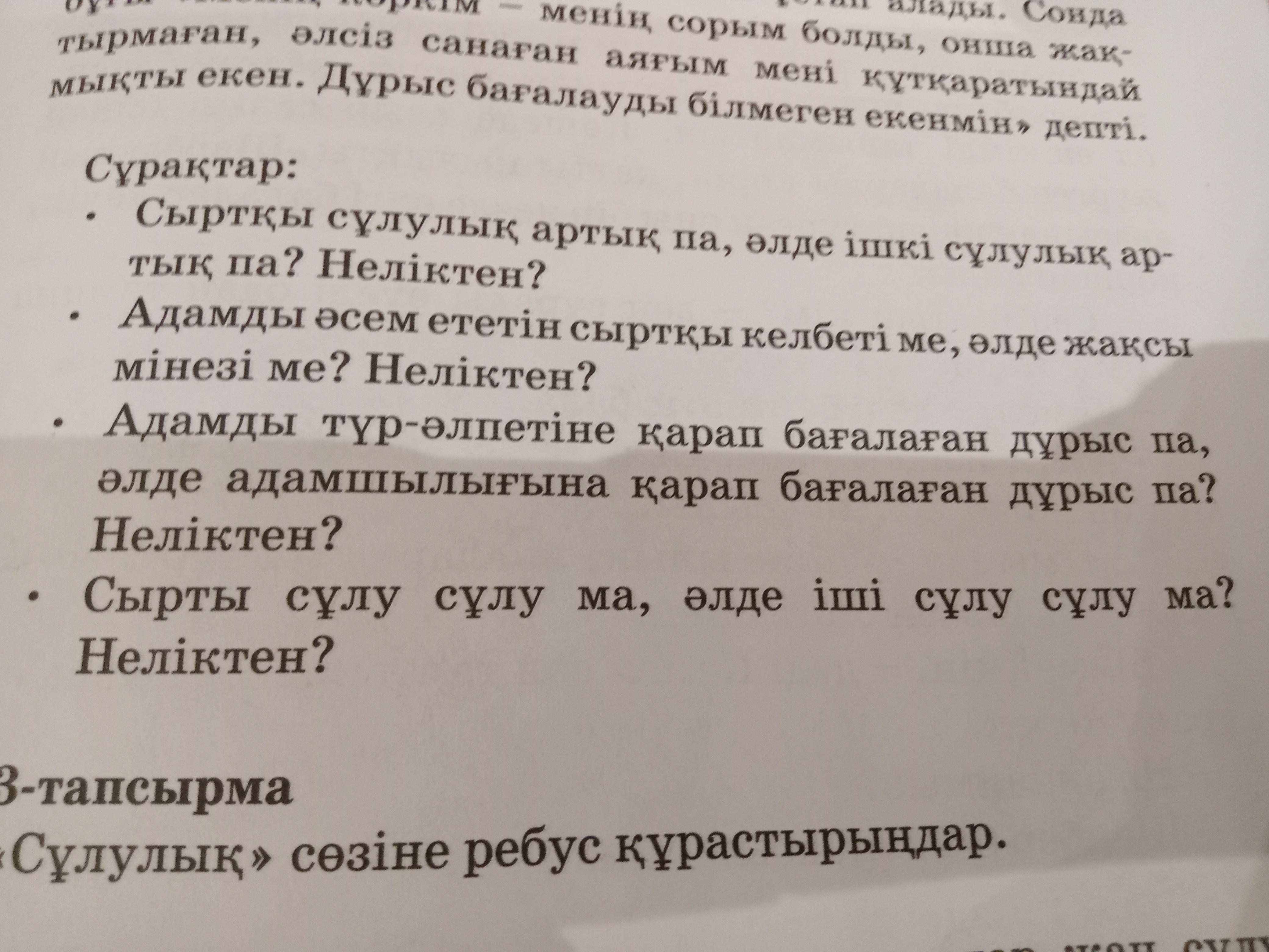 негізі көп адамдар сыртына карап жаксы кореди ал тури жаман болса үнеми менсинби журеди биракта адамның иши яғни жүрегі сулу болса ол адамдарды жактап колдап журеди ал жүрегі сулу емес адамға тек акшасы ғана керек болады адамның озин емес адамның акшасын таңдайды сондықтан менин ойымша иши сулу сулу.