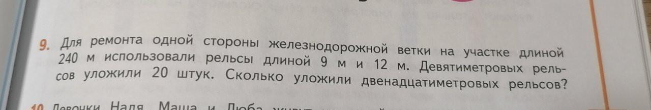(240-20*9):12 = (240-180):12 = 60:12 = 5 (шт.) - двенадцатиметровых рельсов