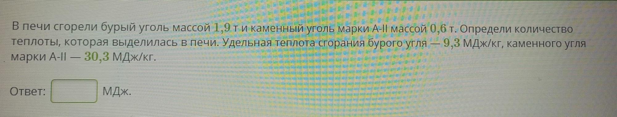 20 БАЛЛОВ.... в печи сгорели бурый уголь массой 1,9т и каменный уголь марки А-ll массой 0,6т. определи количество теплоты которое выделилось в печи удельная теплота сгорания бурого угля 9,3 мдж кг каменного угля марки А-ll 30,3