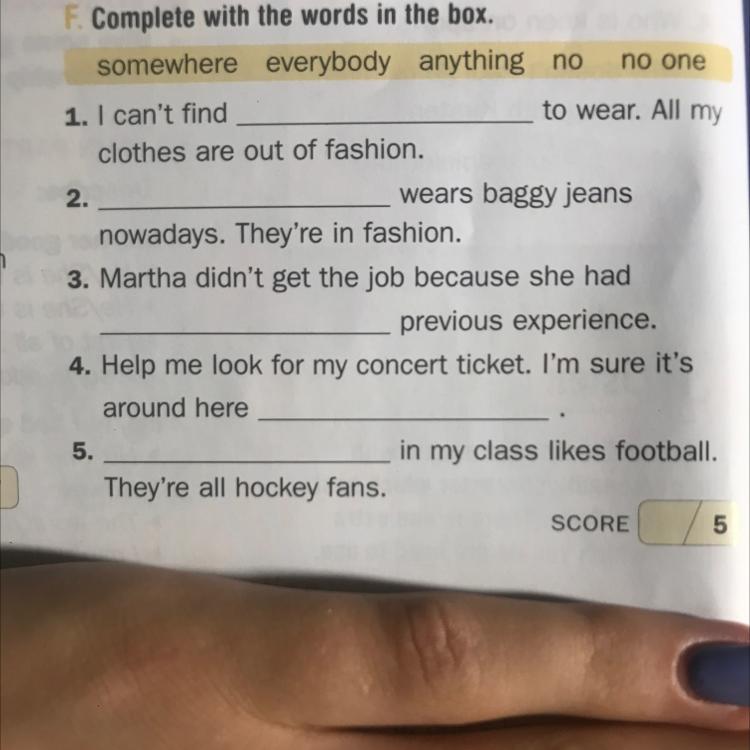 1) no 2) no one 3) anything 4) somewhere 5) everybody