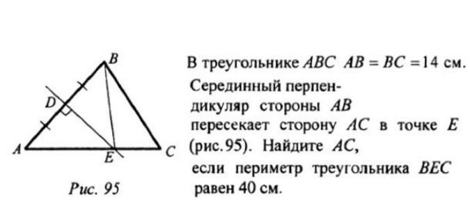 В треугольнике QBC AB=BC=14см. Средний перпендикуляр стороны AB перестает сторону AC, в точке E. Найдите AC, если периметр треугольника BEC равен 40 см.