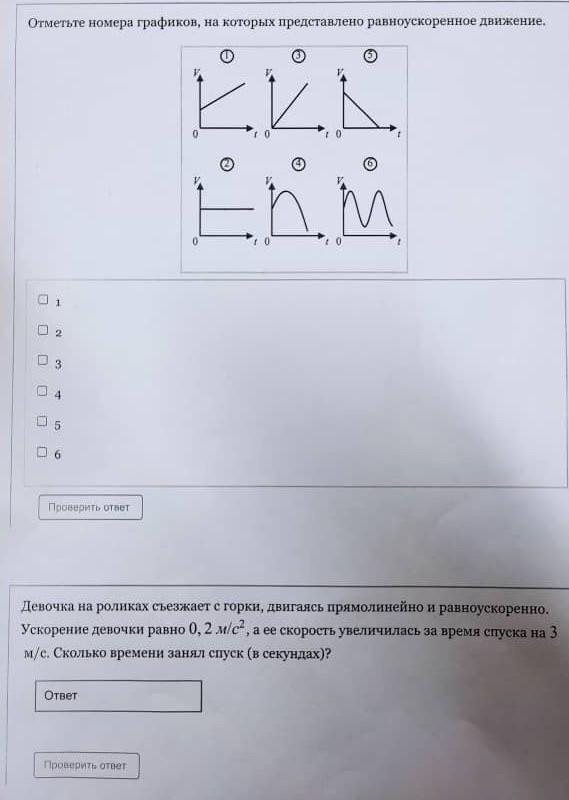 1) При равноускоренном движении скорость изменяется с течением времени равномерно, этому соответствуют графики 1 и 3.