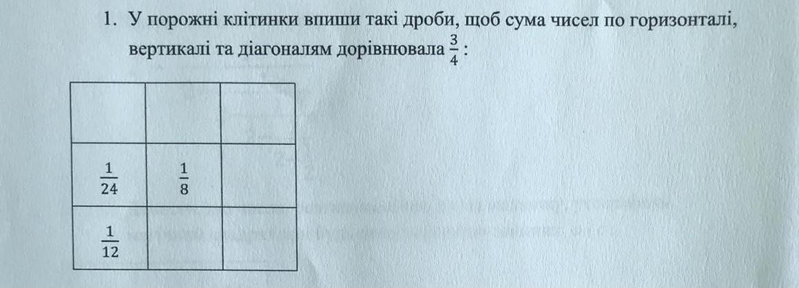 У порожні клітинки впиши такі дроби щоб сума чисел по горизонталі вертикалі та діагоналі дорівнювала 3/4
