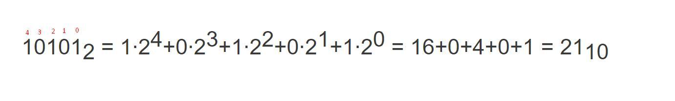 101012=1 ∙ 24 + 0 ∙ 23 + 1 ∙ 22 + 0 ∙ 21 + 1 ∙ 20 = 1 ∙ 16 + 0 ∙ 8 + 1 ∙ 4 + 0 ∙ 2 + 1 ∙ 1 = 16 + 0 + 4 + 0 + 1 = 2110