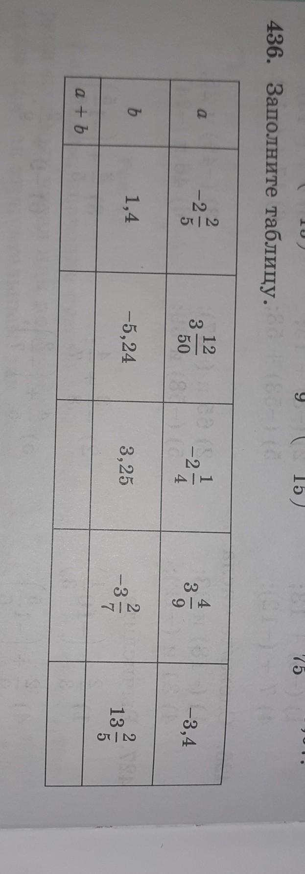 436. Заполните таблицу.a 2 -2/5 312/50 -2 1/4 3 4/9 3,4 b 1,4 -5,24 3,25 -3 2/7 13 2/5