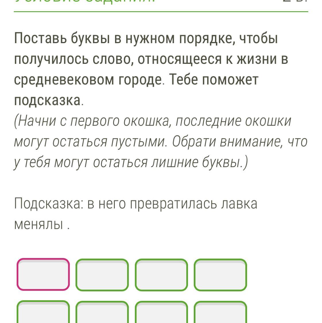 Поставь буквы в нужном порядке, чтобы получилось слово, относящееся к жизни в средневековом городе. Тебе поможет подсказка.