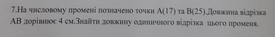 Ответ: Відстань між A і B на числовому промені = 8, довжина цієї відстані = 4 см. Довжина одиничного відрізка на промені = 4:8=0,5 см