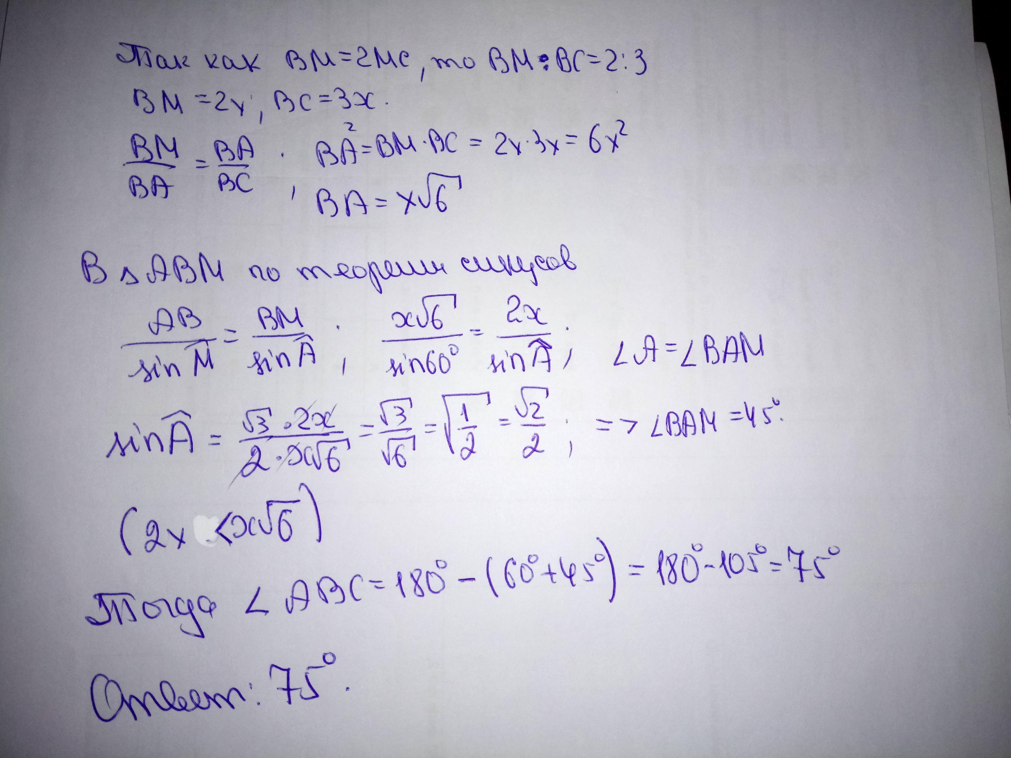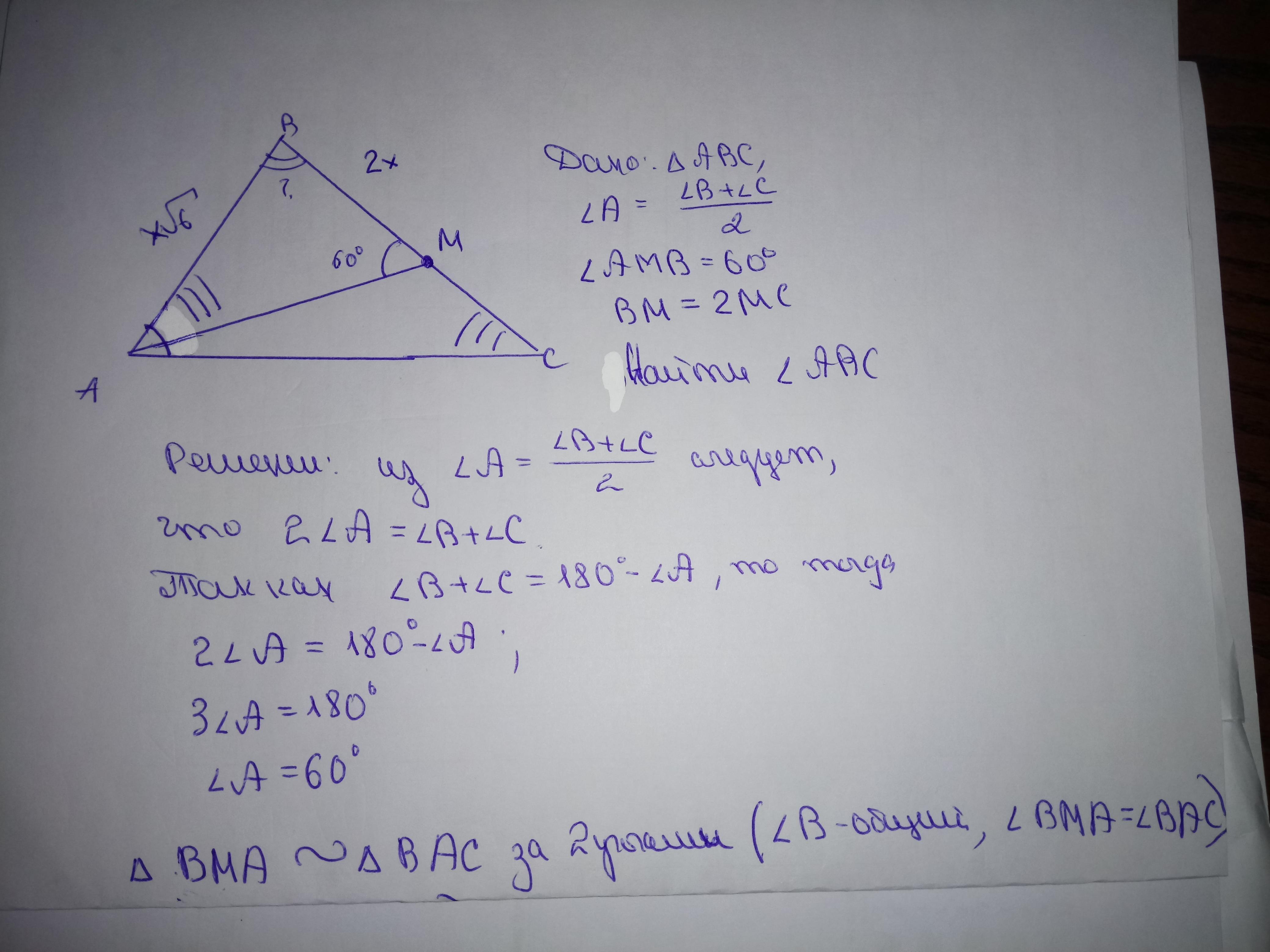 ОЧЕНЬ НУЖНО . У трикутнику АВС кут А дорівнює півсумі двох інших. Пряма АМ перетинає сторону ВС в точці М так, що АМВ=60º і ВМ = 2МС. Знайдіть кут АВС.