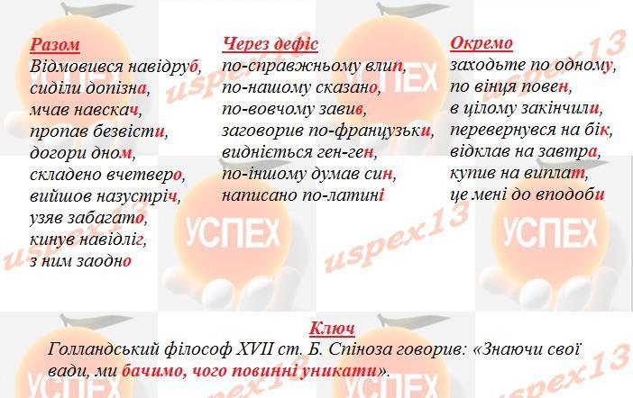 1) разом.; 2) через дефіс; 3) окремо. Відмовився (на) відруб, заходьте (по) одному, сиділи (до) пізна, (по) справжньому влип, (по) нашому сказано, мчав (на) вскач, пропав (без) вісти, (по) вінця повен, (до) гори дном, (по) вовчому завив, складено (в) четверо, (в) цілому закінчили, перевернувся (на) бік, вийшов (на) зустріч, відклав (на) завтра, заговорив (по) французьки, видніється ген (ген), узяв (за) багато, купив (на) виплат, кинув (на) відліг, (по) іншому думав син, з ним (за) одно, написано (по) латині, це мені (до) вподоби.